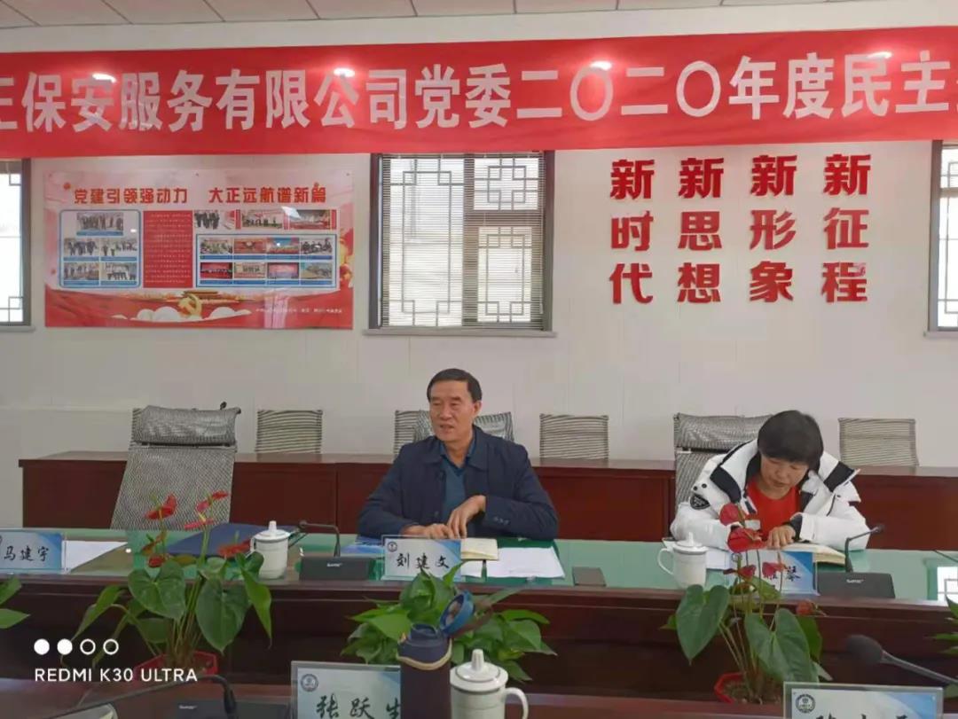 按照市委及市工信局(國資委)黨委安排部署,2021年1月29日下午,山西大正保安服務(wù)有限公司黨委召開2020年度黨員領(lǐng)導(dǎo)干部民主生活會。市工信局(國資委)黨委委員、二級調(diào)研員劉建文同志等市工信局(國資委)指導(dǎo)組同志到會指導(dǎo)。公司黨委書記、董事長張躍生同志主持會議。公司黨委副書記、總經(jīng)理趙培宏同志,黨委副書記、副總經(jīng)理陳志平同志,黨委委員、副總經(jīng)理王明生同志,黨委委員、總經(jīng)理助理邢春生同志,董事、副總經(jīng)理張瑞東同志,董事、財務(wù)總監(jiān)呂雙明同志參加會議,辦公室、黨群工作部負(fù)責(zé)人列席會議。
