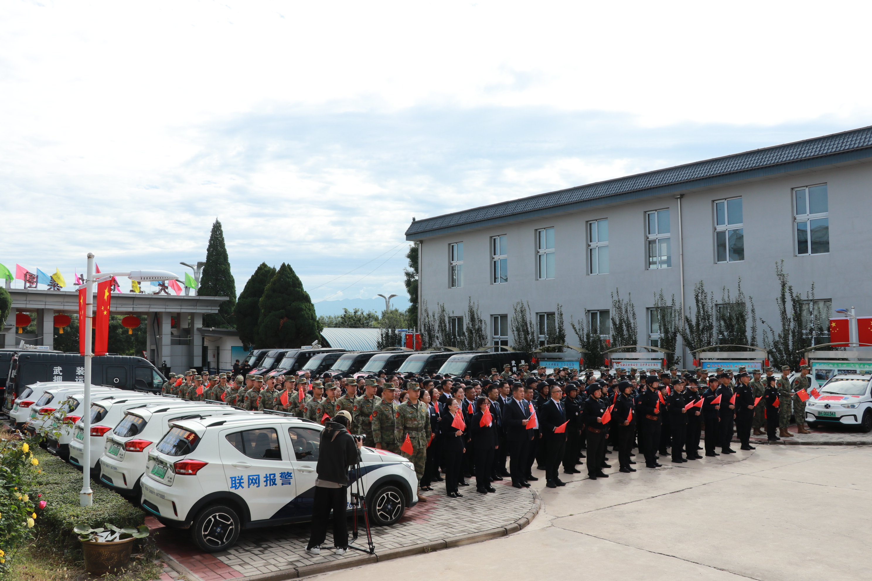 節(jié)日的公司院內(nèi)外,四周花團(tuán)錦簇,大門口燈籠高掛、彩旗飄揚(yáng),為節(jié)日增添了濃厚的喜慶氛圍。公司運(yùn)鈔車、巡邏車、運(yùn)兵車干凈整潔,排列在場地兩側(cè),升旗儀式更顯隆重。9時(shí)30分,集團(tuán)公司、各子公司領(lǐng)導(dǎo)和機(jī)關(guān)各部門、城區(qū)員工共300多人整齊列隊(duì),懷著激動(dòng)的心情,手持小國旗,臉上貼著愛國貼紙、洋溢幸福的笑容,眼神中充滿了對祖國的熱愛和對升旗儀式的期待。