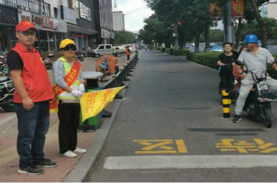 紅燈亮起,停車(chē)線邊的工作人員便舉起手中的小旗,向行人與車(chē)輛作出停止示意,并對(duì)停車(chē)位置有誤的電動(dòng)車(chē)做出指揮和引導(dǎo),對(duì)搶行、闖紅燈等不遵守交規(guī)的行人進(jìn)行制止;對(duì)年紀(jì)較大、腿腳不便的居民,志愿者主動(dòng)攙扶,護(hù)送其安全的過(guò)馬路。在志愿者的文明勸導(dǎo)下,行人闖紅燈現(xiàn)象明顯減少,車(chē)輛和行人安全有序通行,道路交通安全暢通。