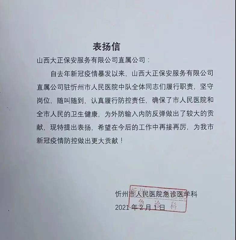 當(dāng)前,境外新冠肺炎疫情暴發(fā)增長態(tài)勢仍在持續(xù),國內(nèi)疫情防控形勢依然嚴(yán)峻,尤其是近期河北、黑龍江等地發(fā)現(xiàn)新冠肺炎確診病例,給我們敲響了警鐘。山西省委、省政府高度重視疫情防控工作,明確提出要嚴(yán)格落實(shí)外防輸入措施,堅(jiān)決守住疫情防控底線。山西大正保安服務(wù)(集團(tuán))有限公司堅(jiān)持以人民利益為中心,秉承公司“服從大局、服務(wù)社會”宗旨,始終認(rèn)清疫情防控形勢,堅(jiān)決克服麻痹思想和厭戰(zhàn)情緒,慎終如始、竭盡全力,緊密配合服務(wù)單位筑牢疫情防控安全網(wǎng),是國有保安企業(yè)堅(jiān)守一線,打贏疫情防控阻擊戰(zhàn)的真實(shí)寫照。