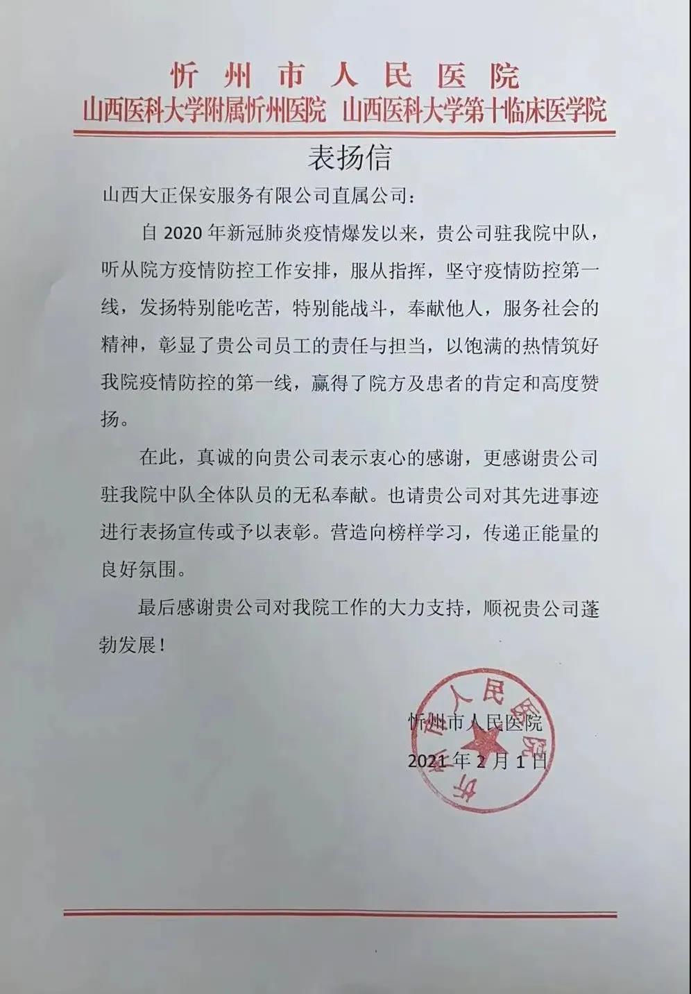 1月27日,直屬公司承接山西大學(xué)中醫(yī)附屬醫(yī)院(忻州市中醫(yī)醫(yī)院)安保勤務(wù),公司組成6人精干小分隊(duì),全面負(fù)責(zé)辦公樓、護(hù)理站、器械庫、住院部的日常安全保衛(wèi)巡查工作。