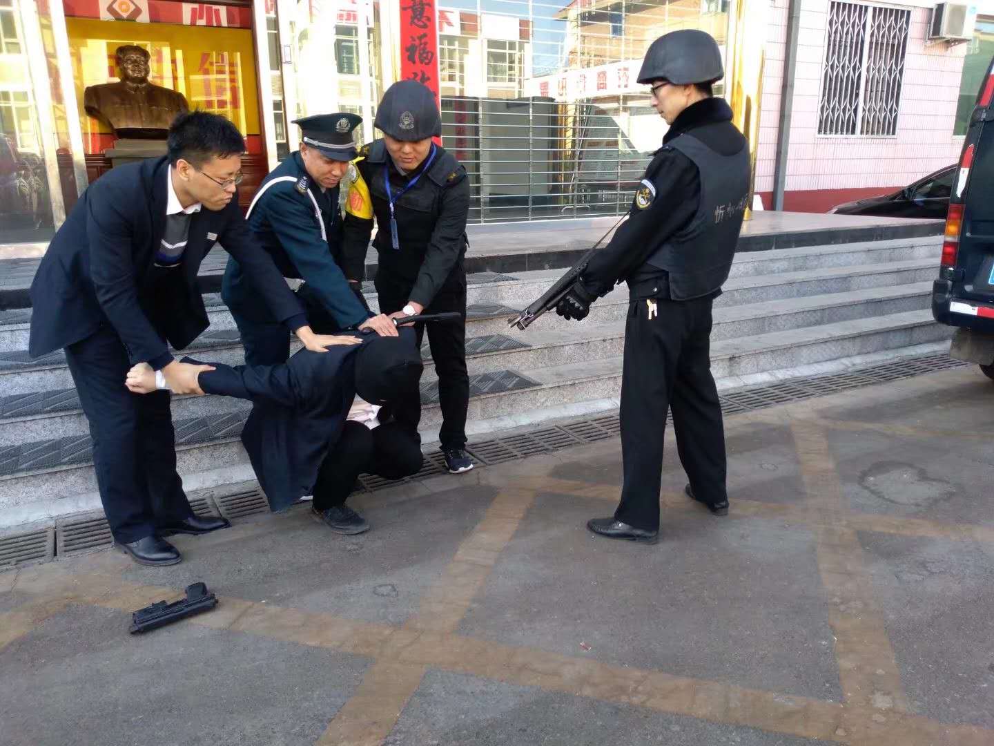 3月16日上午,守押繁峙中隊(duì)聯(lián)合農(nóng)商行組織隊(duì)員進(jìn)行了一次反搶預(yù)案演練。演練內(nèi)容為運(yùn)鈔車抵達(dá)網(wǎng)點(diǎn)后裝卸款箱時(shí)遭遇持械歹徒搶劫。整個(gè)演練過(guò)程,隊(duì)員準(zhǔn)備充分、緊張有序、反應(yīng)迅速、分工明確,拎包員迅速鎖閉金庫(kù)門,司機(jī)立即報(bào)警,押運(yùn)員口頭警告無(wú)效后鳴槍示警,最終合力制服歹徒。